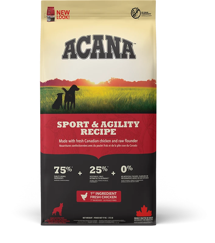 Bereid in onze gecertificeerde keukens in Canada is Acana Dog hondenvoer Sport & Agility rijk aan lokaal gefokte scharrel kip, scharrel eieren, in het wild gevangen platvis, zongerijpt fruit en groenten – geleverd rijk aan voedingsstoffen en door boeren en telers uit onze regio zodat jouw actieve hond in optimale fysiekeconditie blijft.